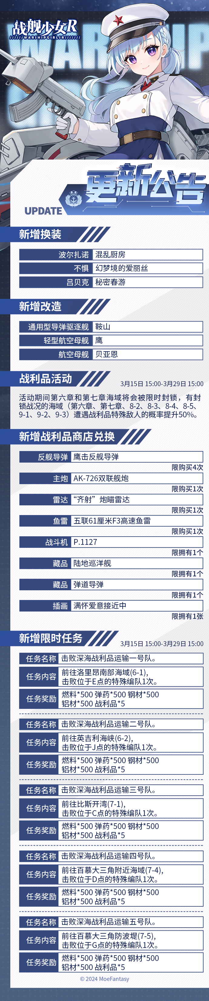 各位玩家,我们将于3月15日10:00 ~ 12:00对《战舰少女R》全部服务器进行不停机更新。期间玩家可正常进入游戏【更新期间游戏内会有更新下载提示,需要玩家下载新的内容,为了避免数据异常请及时进行更新】;对于更新期间给您带来的不便,敬请谅解。